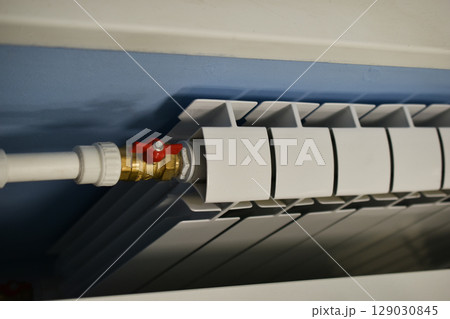 White radiator on grey white wall. apartment heating installation system,