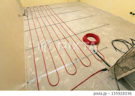 Heating red electrical cable wire roll on cement floor copy space background. Renovation and construction, comfortable warm home concept.