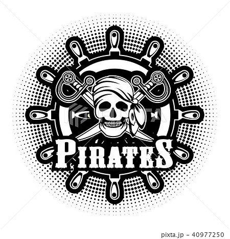 Children pirate party. Symbols of piracy - hat, swords, guns, treasure chest, ship, black flag, jolly roger emblem, skull and crossbones, compass.