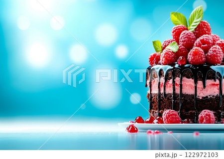 Delicious layered chocolate cake with melted chocolate topping, decorated with fresh raspberries, blackberries, mint leaves and whipped cream is waiting for the celebration