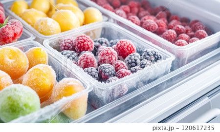Open freezer drawer shows colorful frozen berries and fruits for healthy snacks and desserts