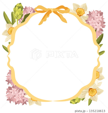 Hand-drawn spring card template with frame and a bow, spring flowers like daffodil and hyacinth, buds and leaves