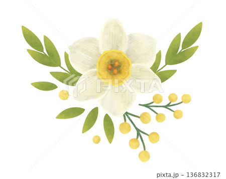 Daffodil flower, composition with green and yellow twigs, leaves in a flat style. Watercolor, pastel, gouache. For product design, prints, textiles