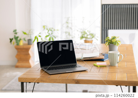 テレワーク 人物なし リビングのダイニングテーブルに置かれたノートパソコン