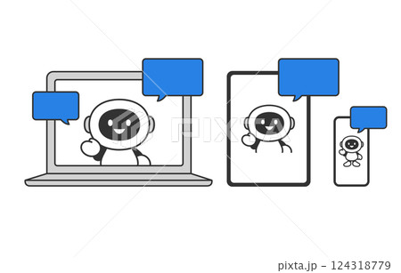 会話をするAIロボット・チャットボットとパソコン・タブレット・スマホのデバイスセット【ベクターイラス
