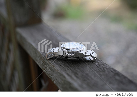 ダイバーズウォッチが置かれたウッドフェンス