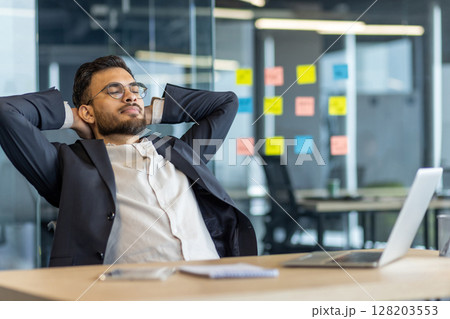 Businessman relaxing and resting inside the office. Man in business suit with hands behind head with closed eyes thinking and dreaming. Boss at workplace, working with laptop.