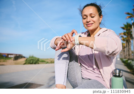 Female athlete checking her heart rate with smartwatch, relaxing after running or bodyweight training outdoor