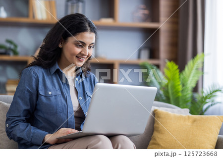 A young woman in a denim shirt smiles while using her laptop on the sofa at home, staying connected and productive.