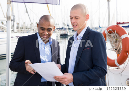 Two men in suits buy and sell a yacht in the seaport