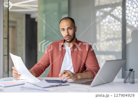 A focused businessman reviews paperwork at his desk, a laptop and calculator beside him, inside a bright office space.