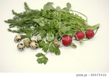 Cilantro with fresh quail eggs, dill and round red radish on a white background