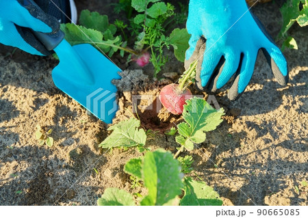 Farmer is picking fresh red ripe radish on the garden bed