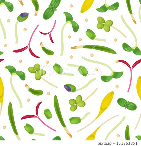 Microgreens seamless pattern. Repeated sprouts of edible plants, sprouted seeds, radishes, mustard, lettuce, peas. Decor textile, wrapping paper, wallpaper. Print classy vector background