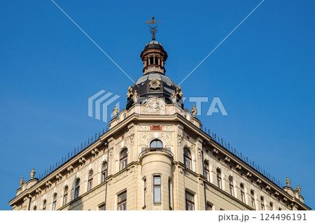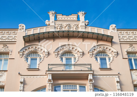 Latvian tourist landmark attractions - Art Nouveau architecture, beautiful building facade in downtown of Riga city, Latvia.