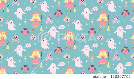 Cute pink ghosts, witch, owl, pumpkin seamless pattern. Halloween baby characters. Magic scary spirits with different emotions. Vector cartoon illustration.