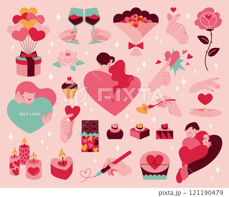 Valentine's day, February 14. Vector illustrations of love, heart, gift, champagne glasses, confetti sweets. Drawings for postcard, card, congratulations and poster.