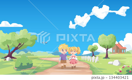 Cute cartoon couple boy and girl holding hands walking from house. Walking on soil road. With heart shaped clouds in blue sky. Arrows pierced both hearts. Happy Valentine's day vector illustration.