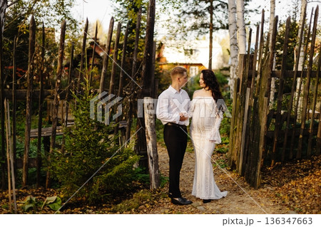 Couple walks hand-in-hand along rustic fence. Man and woman enjoying stunning mountain landscape. Clear blue sky and lush greenery create peaceful and romantic atmosphere.