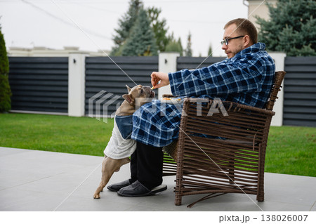Man in plaid robe sits outdoors and feeds his french bulldog.