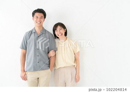 同棲・新婚イメージ、ソファに座る笑顔のカップル