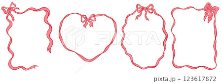Set of coquette Valentine's day romantic clipart decorated with bow. Various elements with knotted ribbons. Vector contour hand drawn dotted illustrations for posters, cards, logo, printing on t-shirt