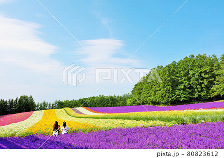 北海道 青空の富良野 綺麗な花畑