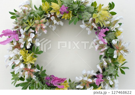 水彩画。ラベンダーと草木のリースイラスト。水彩タッチの植物装飾リースフレーム。