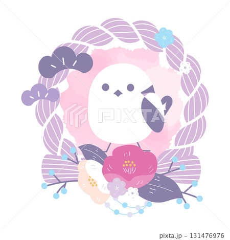 紫のしめ縄と横向きシマエナガ、梅の和風リース(お正月飾り)