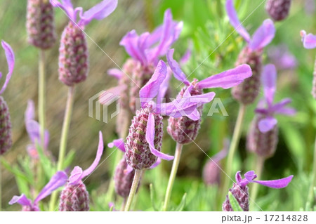 春の陽を浴びる薄紫色のフレンチラベンダーの花