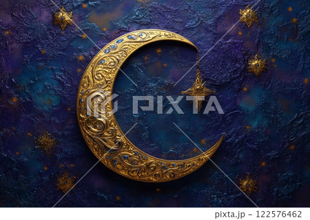 Intricate Golden Crescent Moon with Hanging Star on Textured Wall