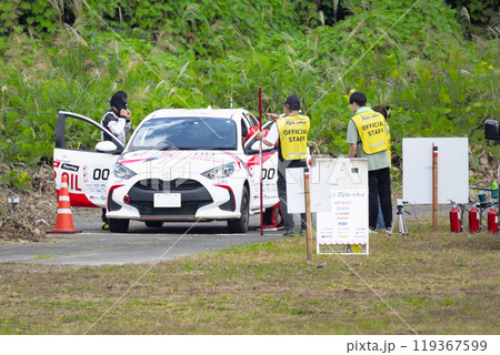 利府ラリーパルクフェルメで再車検待のラリー競技車両