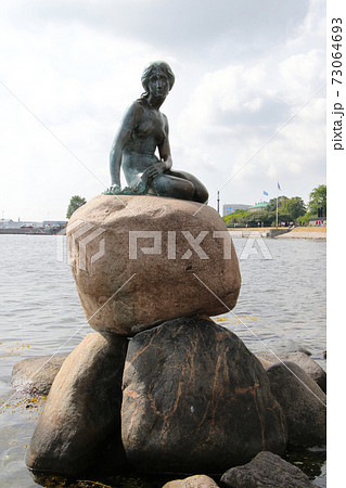 デンマーク・コペンハーゲンの観光名所 大きな石の上にすわる 人魚姫 背景はカステレッド側