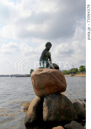 デンマーク・コペンハーゲンの観光名所 石の上にすわる 人魚姫 雲の空を背景に