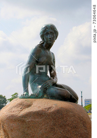 デンマーク・コペンハーゲンの観光名所 明るい空に物憂げな表情を見せる人魚姫 縦位置
