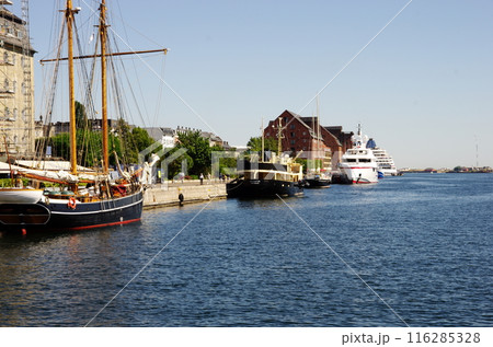 コペンハーゲンの埠頭に停泊中の運河クルーズ船