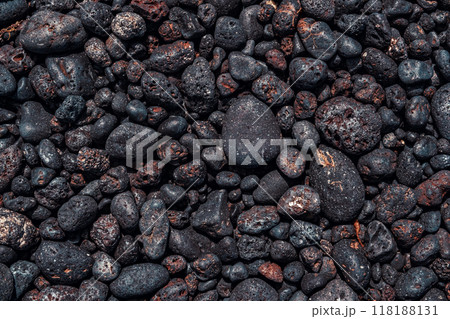 A moon landscape with lava formations, volcanic mountains, volcanoes and desert at sunset.