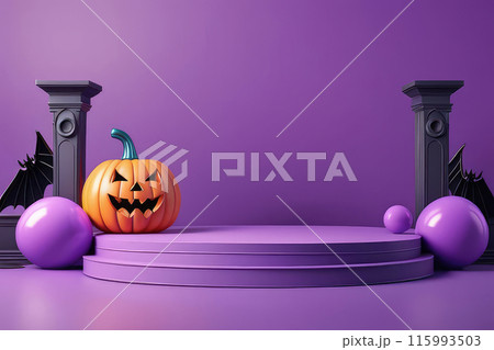 Happy greeting with podium and balloons, pumpkin for Festive Halloween mock up decoration on a purple background.