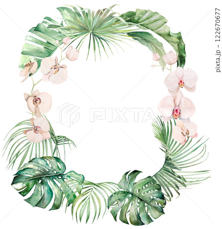Frame with green watercolor tropical leaves and pink orchid flowers, Wedding isolated illustration