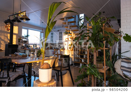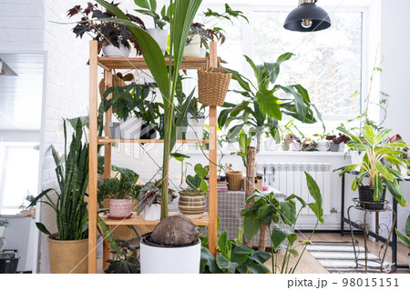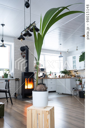 Coconut palm in a pot at home in interior. Green house, care and cultivation of tropical plants