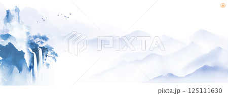 Serene landscape with misty mountains, flowing waterfall, and birds flying. Traditional oriental ink painting sumi-e, u-sin, go-hua. Hieroglyph - eternity
