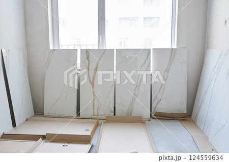 A large marble tile for walls measuring 120 by 60 is displayed in a row,the selection of the pattern on the tile for laying on the walls.On the background of a window under daylight.High quality photo