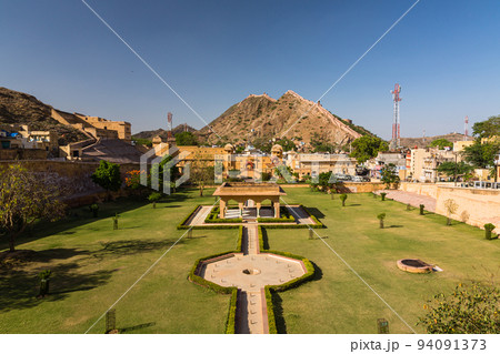 インド ジャイプルのアンベール城横にあるムガール様式の庭園とジャイガール要塞の城壁