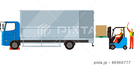 中型トラック後方から荷物を積むフォークリフトと誘導員のイメージ