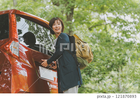 車に荷物を積む若い女性