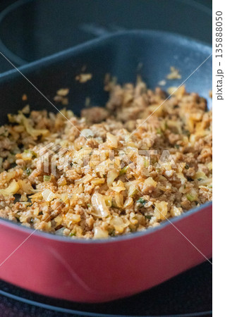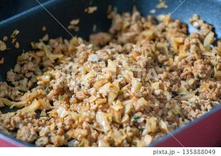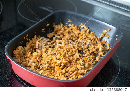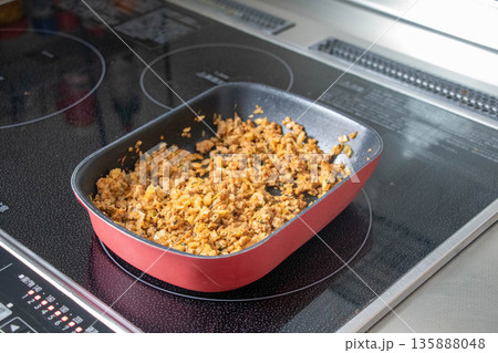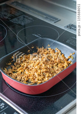 フライパンで調理中のそぼろ料理