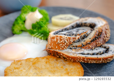黒ごまパンとハッシュドポテト、目玉焼きが並ぶ洋風朝食セット