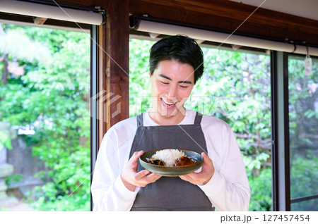 エプロン姿の男性が笑顔でハンバーグを持ち和やかな雰囲気を漂わせる