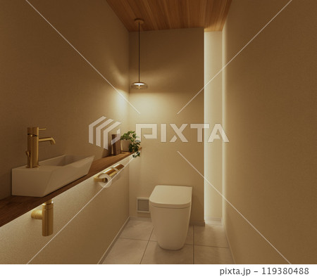 間接照明で落ち着くトイレデザイン 木と真鍮がお洒落な北欧ナチュラルテイストのインテリア