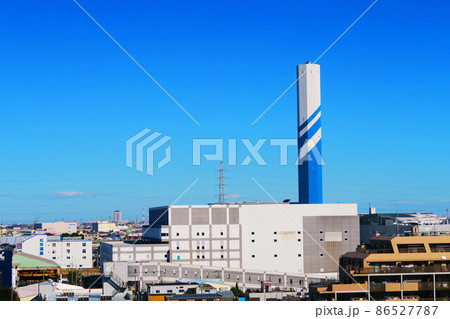 埼玉県川口市の朝日環境センターの煙突と青空の風景